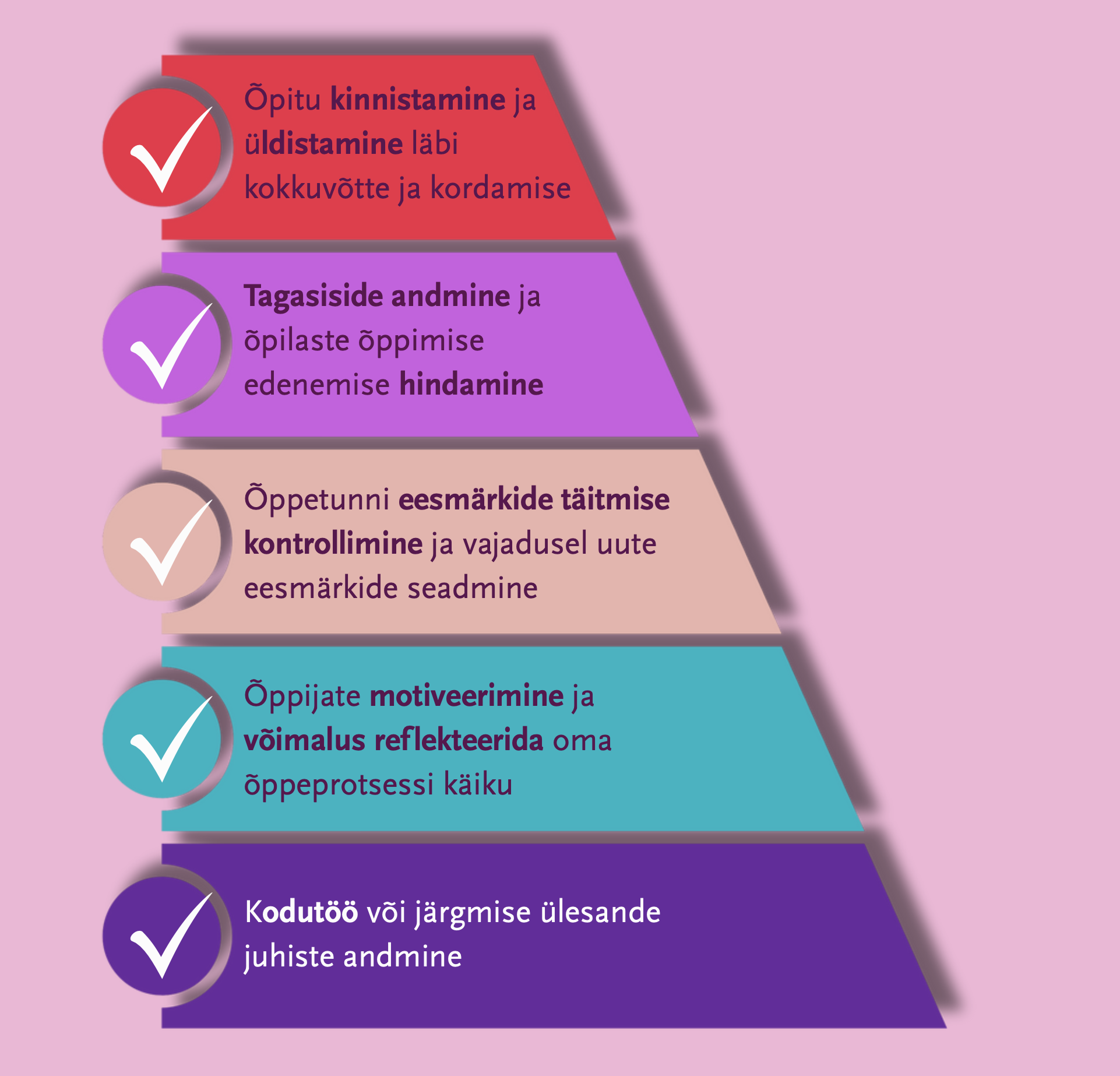 Tunni kokkuvõte on hea aeg paluda õpilastel reflekteerida selle üle, kui hästi nad said tunnis hakkama nii ainesisu õppimisel kui ka uue sõnavara omandamisel. Enesehindamise jaoks võib kasutada lausete lõpetamise harjutust, mille raames õpilased lõpetavad selliseid lauseid, nagu: Täna mul läks tunnis hästi…., Vajan veel aega …., Pean veel harjutama.