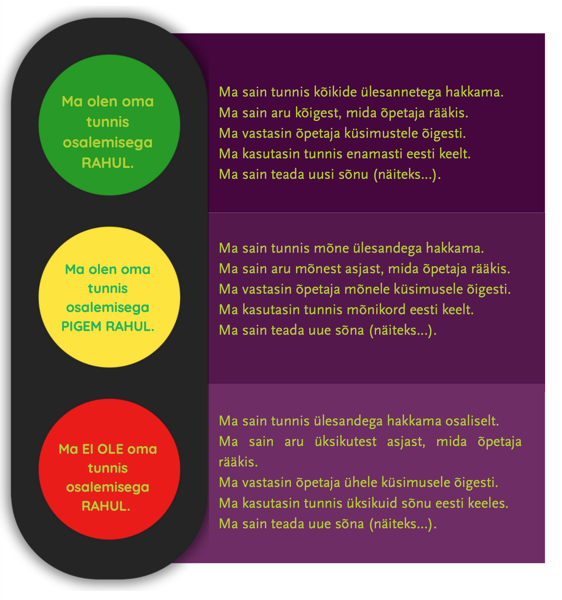 Enesehindamise läbiviimist võivad toetada ka valmistehtud töölehed, näiteks “Tunni valgusfoor”, mille pidev kasutamine aitab õpilastel kujundada oskust hinnata oma hakkama saamist eestikeelses õppes.